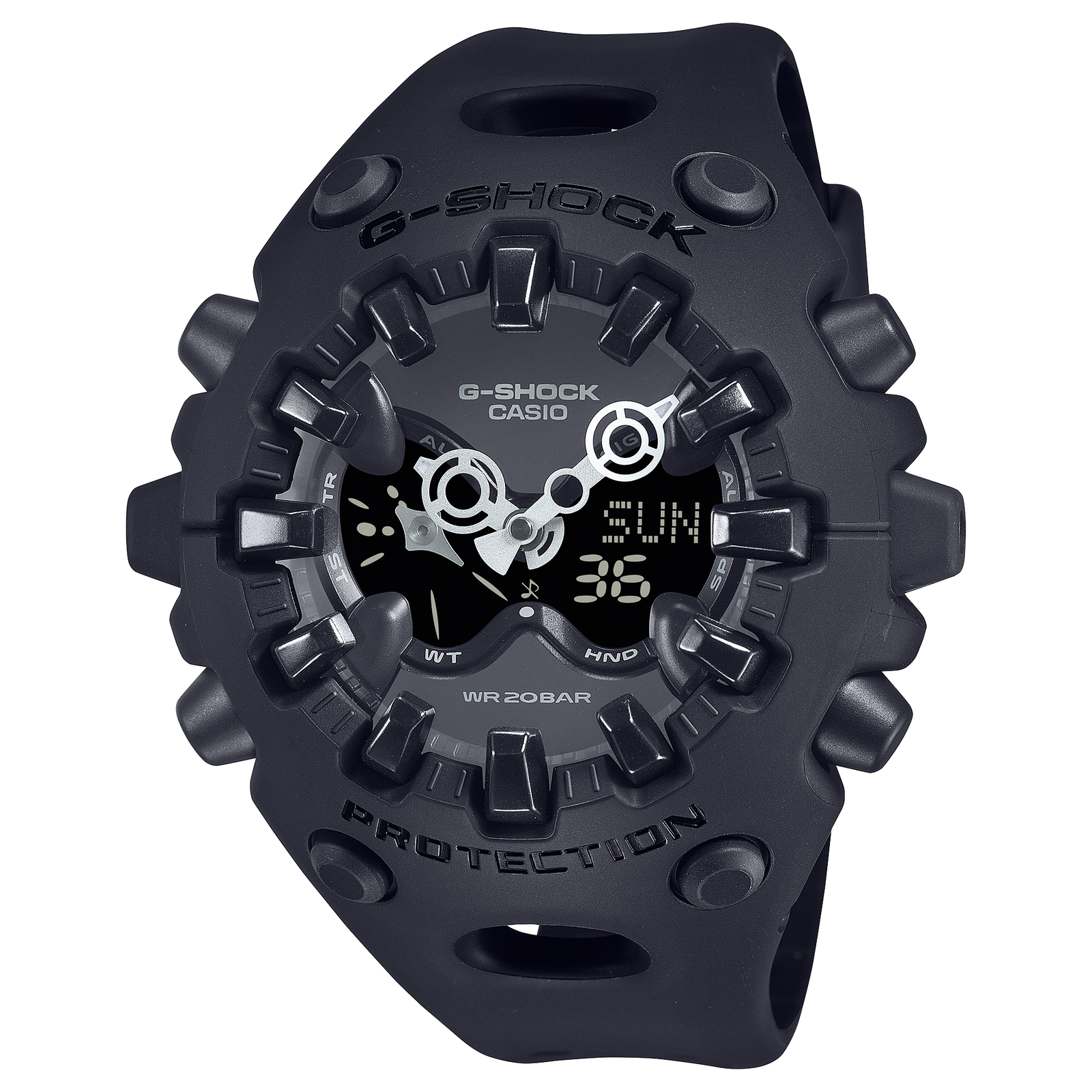 Le boĂźtier central protĂ©geant le module est recouvert d’un revĂȘtement oĂč la lunette et le bracelet sont intĂ©grĂ©s. Les grands index en relief sâemboitent sur le verre du cadran, et permettent ainsi de le protĂ©ger en absorbant les chocs. Ce revĂȘtement unique et inĂ©dit reste fidĂšle Ă la rĂ©sistance caractĂ©ristique de G-SHOCK, mais dans un tout nouveau design.