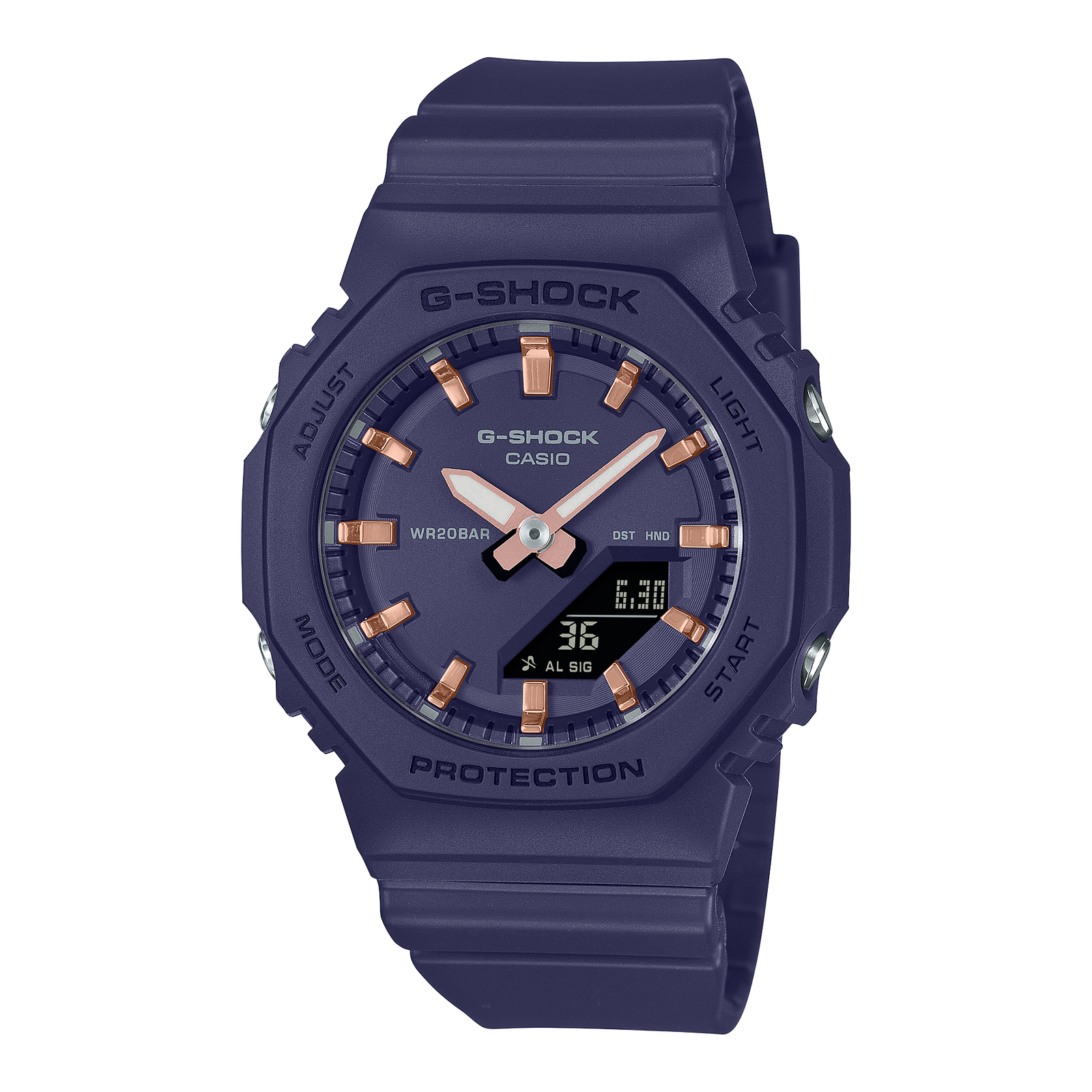 En plus de possĂ©der un design compact qui sâadapte facilement aux poignets les plus fins, la GMA-P2100 est dotĂ©e dâindex mĂ©tallisĂ©s rose dorĂ© rĂ©alisĂ©s par dĂ©pĂŽt de vapeur.